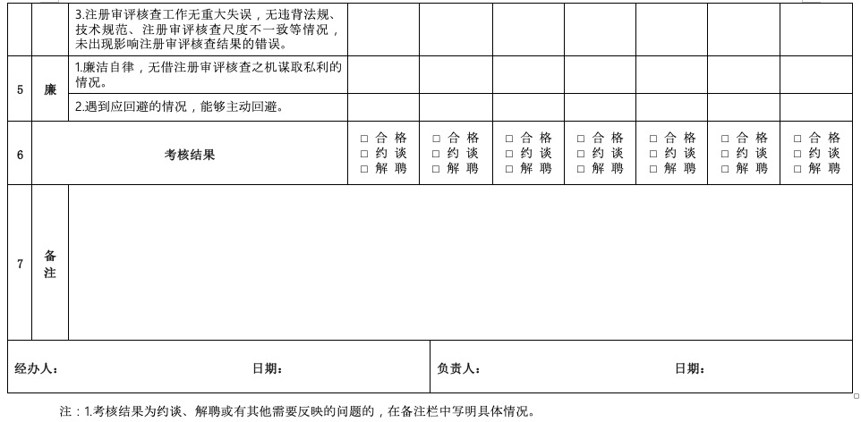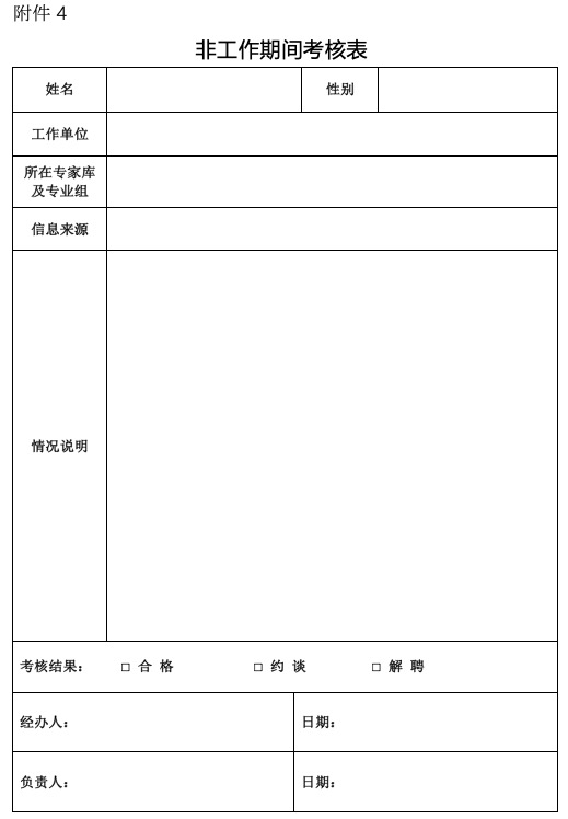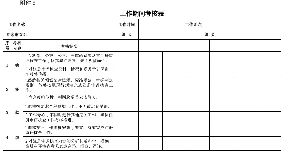第十九條 食審中心通過工作期間考核表(附件3)對專家在參與注冊審評核查工作期間的履職情況進行考核;在專家未參與注冊審評核查工作期間,食審中心發(fā)現(xiàn)的其注冊審評核查意見有誤、違規(guī)違紀等情況,通過非工作期間考核表(附件4)進行考核。