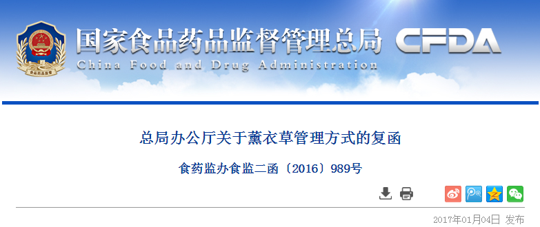 你局《關(guān)于明確薰衣草管理方式的請示》(冀食藥監(jiān)〔2016〕51號)收悉。經(jīng)商農(nóng)業(yè)部和衛(wèi)生計(jì)生委,現(xiàn)函復(fù)如下: