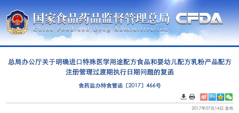 你局《關(guān)于特殊醫(yī)學(xué)用途配方食品注冊和嬰幼兒配方乳粉產(chǎn)品配方注冊要求中進(jìn)口產(chǎn)品執(zhí)行日期問題的請示》(滬食藥監(jiān)食生函〔2017〕131號)收悉。經(jīng)研究,現(xiàn)函復(fù)如下:
