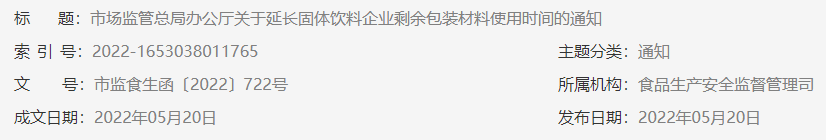 《市場(chǎng)監(jiān)管總局關(guān)于加強(qiáng)固體飲料質(zhì)量安全監(jiān)管的公告》(2021年第46號(hào))(以下簡(jiǎn)稱《公告》)發(fā)布以來(lái),有關(guān)食品行業(yè)協(xié)會(huì)、固體飲料生產(chǎn)企業(yè)和地方市場(chǎng)監(jiān)管部門陸續(xù)反映,受新冠肺炎疫情影響,部分固體飲料生產(chǎn)企業(yè)現(xiàn)有產(chǎn)品包裝材料有一定數(shù)量的剩余。為嚴(yán)格執(zhí)行《公告》,減少浪費(fèi),幫助企業(yè)紓困解難,經(jīng)研究決定,固體飲料生產(chǎn)企業(yè)現(xiàn)有產(chǎn)品包裝材料在2022年6月1日前未使用完畢的,可以延期使用至2022年12月31日。