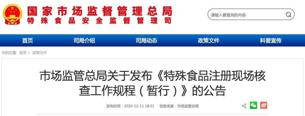 為規(guī)范特殊食品注冊現(xiàn)場核查工作,依據(jù)《中華人民共和國食品安全法》《保健食品注冊與備案管理辦法》《嬰幼兒配方乳粉產(chǎn)品配方注冊管理辦法》《特殊醫(yī)學用途配方食品注冊管理辦法》等法律規(guī)章,市場監(jiān)管總局制定了《特殊食品注冊現(xiàn)場核查工作規(guī)程(暫行)》,現(xiàn)予發(fā)布,自公布之日起施行。