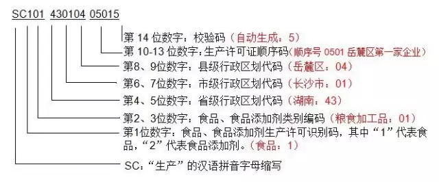 一、食品生產(chǎn)許可證編號由SC(“生產(chǎn)”的漢語拼音字母縮寫)和14位阿拉伯?dāng)?shù)字組成。數(shù)字從左至右依次為:3位食品類別編碼、2位省(自治區(qū)、直轄市)代碼、2位市(地)代碼、2位縣(區(qū))代碼、4位順序碼、1位校驗(yàn)碼。