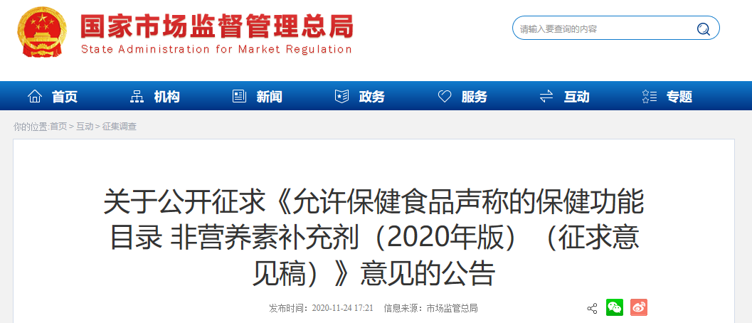 公眾還可以登錄國(guó)家市場(chǎng)監(jiān)督管理總局網(wǎng)站(http://www.samr.gov.cn),通過首頁(yè)互動(dòng)欄目中的“征集調(diào)查”提出意見建議,或者將意見建議郵寄至:市場(chǎng)監(jiān)管總局特殊食品司,北京市西城區(qū)北露園1號(hào),并在信封上注明“《允許保健食品聲稱的保健功能目錄 非營(yíng)養(yǎng)素補(bǔ)充劑(2020年版)(征求意見稿)》公開征求意見”字樣。