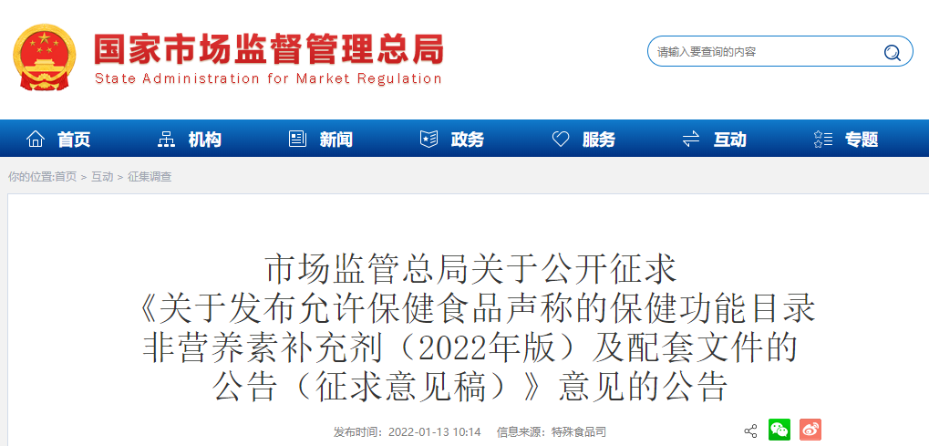 為進一步推進保健食品注冊工作,根據(jù)《中華人民共和國食品安全法》《保健食品注冊與備案管理辦法》《保健食品原料目錄和功能目錄管理辦法》,市場監(jiān)管總局組織制定了《關于發(fā)布〈允許保健食品聲稱的保健功能目錄 非營養(yǎng)素補充劑(2022年版)〉及配套文件的公告(征求意見稿)》,現(xiàn)面向社會公開征求意見,意見建議反饋截止時間為2022年2月12日。公眾可以通過以下途徑和方式提出意見建議: