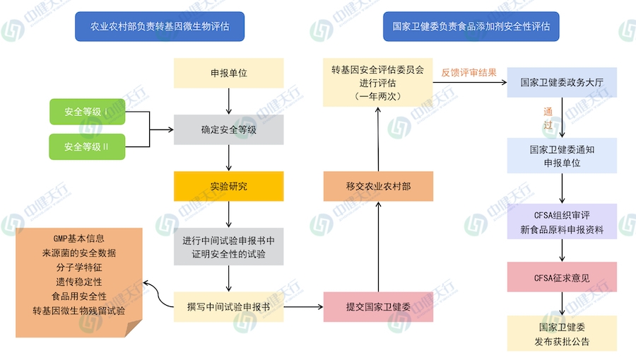 食品添加劑申報部分按照食品添加劑新品種的相關規(guī)定進行審批與安全性評價,相關的管理規(guī)定主要包括《食品安全法》、《食品添加劑新品種管理辦法》、《食品添加劑新品種申報與受理規(guī)定》等,轉基因微生物安全評估主要參考《動物用轉基因微生物安全評價指南》的相關規(guī)定,申請人按照上述規(guī)定準備申報材料,向國家衛(wèi)生健康委員會提出受理申請,首先由農業(yè)農村部評價轉基因菌種的安全性,然后由國家衛(wèi)生健康委員會評價轉基因微生物食品添加劑新品種的安全性和工藝必要性。具體申報流程如下: