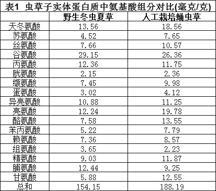 由表1可知:與野生冬蟲夏草相比,人工培養(yǎng)蛹蟲草的子實體中的氨基酸組成完全一致,但不同氨基酸的含量及氨基酸的總量存在一定差異。蛹蟲草子實體中的氨基酸總量高。