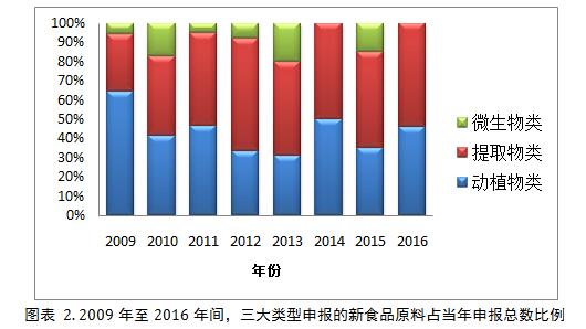 通過對國家衛(wèi)生計生委衛(wèi)生行政許可公眾查詢數據庫的信息檢索分析后,筆者發(fā)現(xiàn)2009年至2016年共七年間,截至2016年10月28日,國家衛(wèi)計委共公開受理新食品原料申報251件,其中29%申報的新食品原料為進口,71%的為國產 (圖表 1)。絕大多數申報的新食品原料為中國本土資源,側面體現(xiàn)了我國有豐富的資源值得食品行業(yè)開發(fā)和利用。