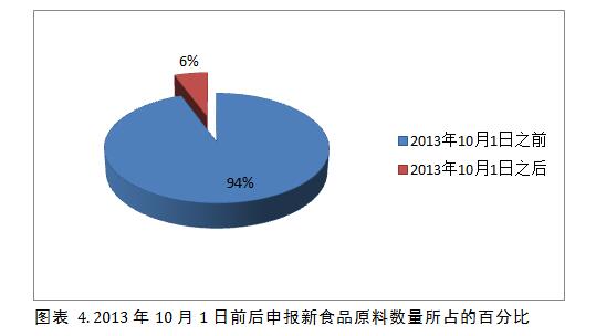 《新食品原料安全性審查管理辦法》于2013年2月5日經原衛(wèi)生部部務會審議通過,自2013年10月1日起施行。換言之,2013年10月1日以后,國家將按照新的審查管理辦法來管理新食品原料申報。新的政策初步執(zhí)行階段,國家會在相當一段長的時間內展開一些法規(guī)宣講會和政策解讀會,幫助企業(yè)、檢測機構、各相關政府部門明確各自的角色和職能,各方從而更快地適應新的法規(guī)。這樣的情況下,更多的企業(yè)會選擇在新法規(guī)頒布前按照舊辦法加速提交申報,而很少有企業(yè)在新法規(guī)政策執(zhí)行不明朗的情形下貿然提交申請,做‘第一個吃螃蟹的人’。94%的企業(yè)選擇在2013年10月1日前提交申報 (圖表 4),恰好就是企業(yè)選擇先觀望的很好的說明,也解釋了為什么2013年成為新食品原料申報的‘黃金年代’。
