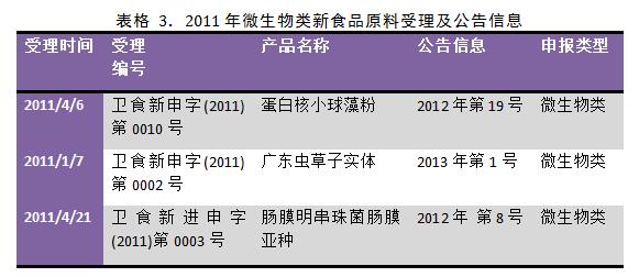 2011年至2013年間,申報微生物類新食品原料所占總申報數量的比重呈階梯式增長,2013年的為2011年的近四倍。2015年申報微生物類新食品原料所占比重雖然比2013年稍有下滑,但與歷年相比該值依舊屬于在較高水平??梢钥闯鑫⑸镱惖男率称吩险谥鸩匠蔀槠髽I(yè)申報新食品原料的新‘寵兒’。 相信隨著國內市場的擴大和研究人員的努力, 未來幾年益生菌將會進一步引導功能性食品的市場潮流。